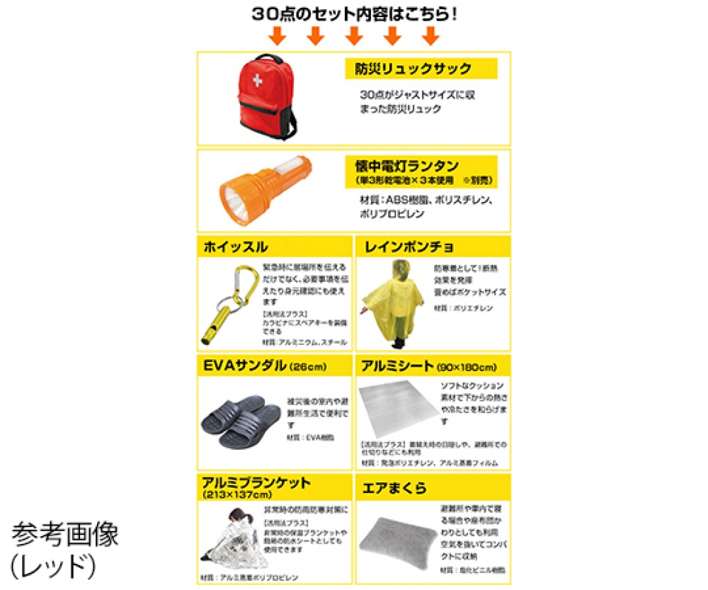 - Set contents: Backpack, emergency whistle, 2-way screwdriver, mini cutter knife, compression bag, spare bag (coin purse), writing utensil set, 3 toothbrushes, 20 cotton swabs, 3 masks, 3 portable toilets, 3 plastic bags 45 L, 3 paper plates, 5 plastic cups, 5 disposable chopsticks, spoon/fork set, 2-way flashlight, rubber gloves, medicine case, cloth tape, rain poncho, EV sandals, aluminum sheet, aluminum blanket, air pillow, emergency water supply bag, wrap, aluminum foil, body towel, tissue