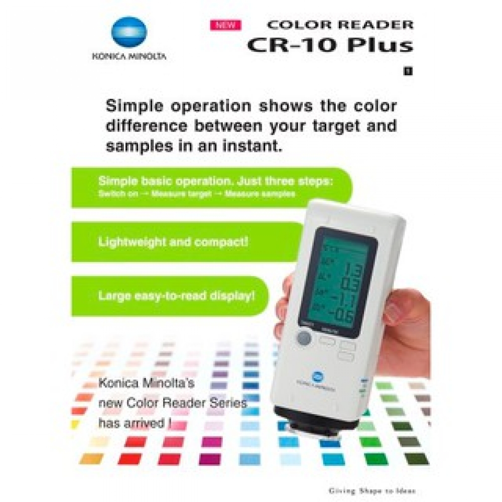 Konica Minolta's CR-10 Plus (successor to the CR-10) color difference reader is a portable, battery powered, and hand-held instrument for quick, precise color control. The CR-10 Plus tristimulus colorimeter is easily operable, economical and portable like never before. With a built-in utility software application, it allows changing of instrument settings, set tolerances, pass/fail judgment and data analysis directly on the instrument. Also includes USB connectivity to a computer for easy data transferring.