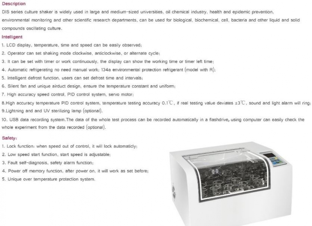 Desktop Incubator Shaker DIS can be used for biological, biochemical, cell, bacteria and other liquid and solid compound oscillating culture. Desktop Incubator Shaker DIS is widely used is large and medium sized universities, oil chemical industry, health and epidemic prevention, environmental monitoring and other scientific research department.