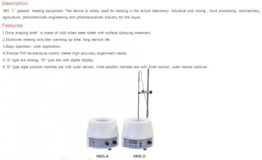 Heating Mantle Anolog type HM-A maximum temperature for heating is 380°C. Heating Mantle Anolog type HM-A is widely used for heating in school laboratory, industrial and mining, food processing, biochemistry, agricultures, petrochemicals engineering and pharmaceuticals industry for the liquid.