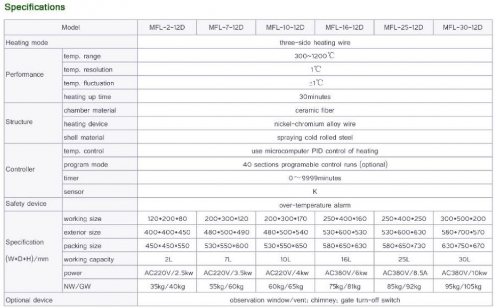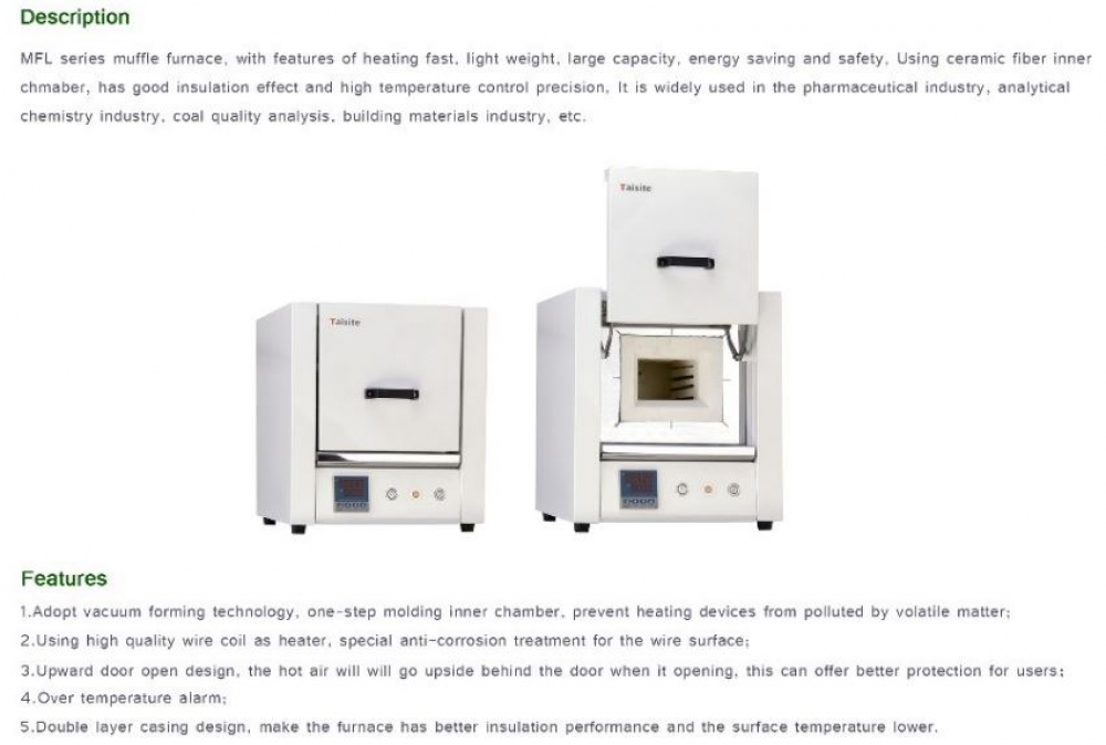 MFL muffle furnace using ceramic fiber inner chamber, has good insulation effect and high temperature control precision. MFL muffle furnace has the features of heating fast, light weight, large capacity, saving energy and safety. MFL muffle furnace, is widely used in the pharmaceutical industry, analytical chemistry industry, coal quality analysis, building materials industry, etc.