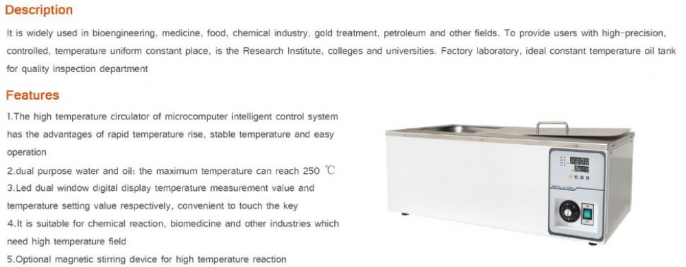 Oil bath it is widely used in bioengineering, medicine, food, chemical industry, gold treatment, petroleum and other fields. To provide users with high-precision, controlled, temperature uniform constant place, is the Research Institute, colleges and universities. Factory laboratory, ideal constant temperature oil tank for quality inspection department.