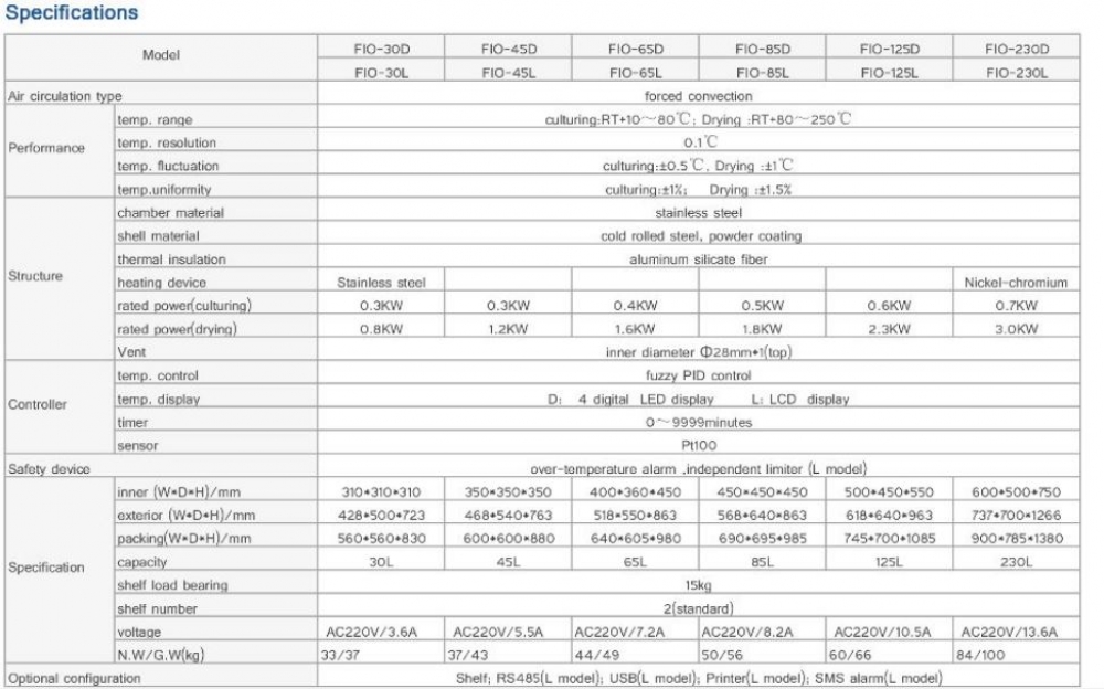 FIO series drying oven is an oven and incubator double used device. With a switch, it can exchange the heating elements inside, to define it is used as an oven or incubator. It is perfect choice for some small labs which have limited space.