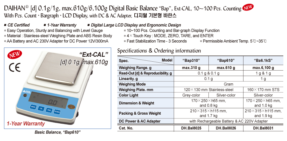 DAIHAN® [d] 0.1g/1g, max.610g/6,100g Digital Basic Balance “Bap”