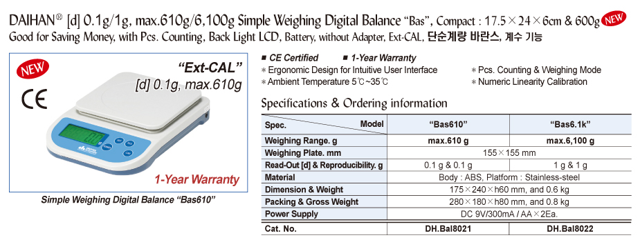 DAIHAN® [d] 0.1g/1g, max.610g/6,100g Simple Weighing Digital Balance “Bas”