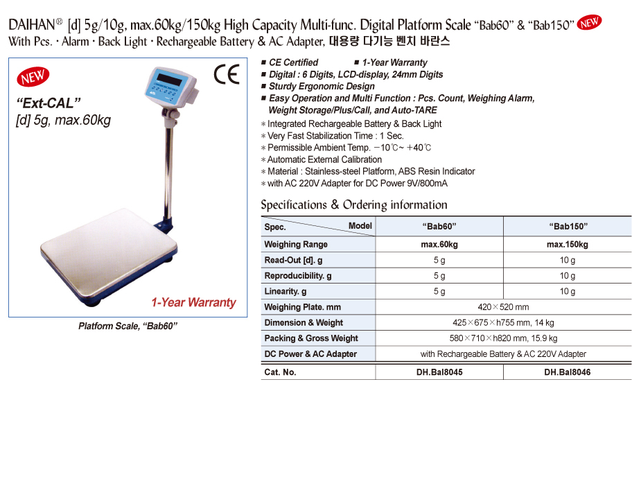 DAIHAN® [d] 5g/10g, max.60kg/150kg High Capacity Multi-func. Digital Platform Scale