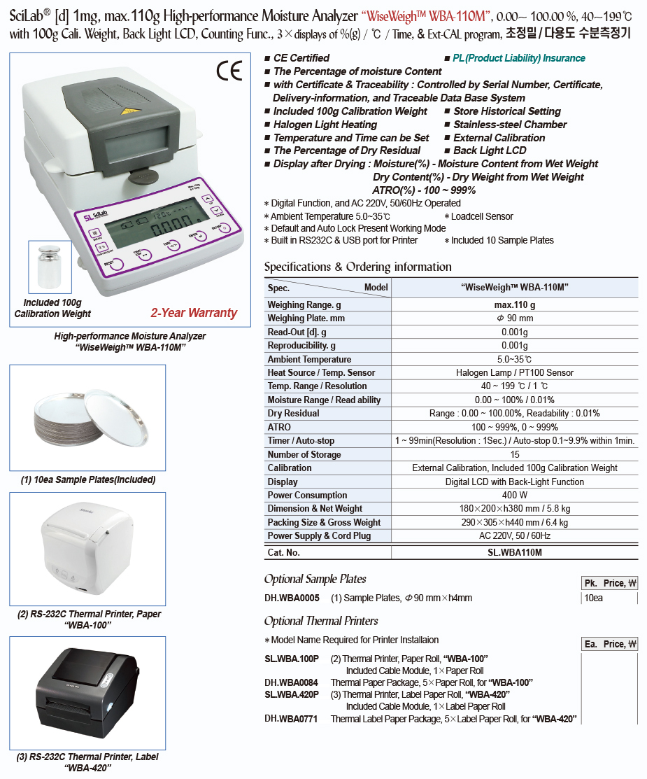 Description : Digital Moisture Analyzer, Max. 110g, d=1mg, 40-199℃, 0.00~100%, AC220V(=DH.WBA110M)