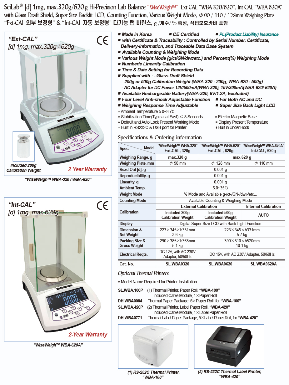 Description : High-precision Balance,, AUTO Calibration, Max. 620g, d=1mg, 230V, WBA-620A(=DH.WBA0620A)
