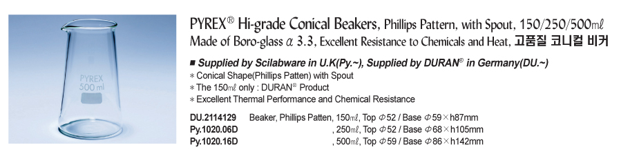 PYREX® Hi-grade Conical Beakers, Phillips Pattern